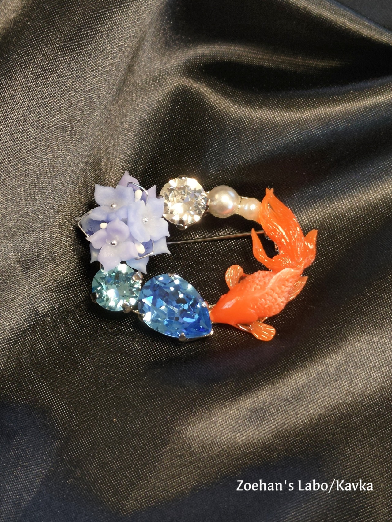 鉢の中を泳ぐ金魚をイメージしたブローチ。